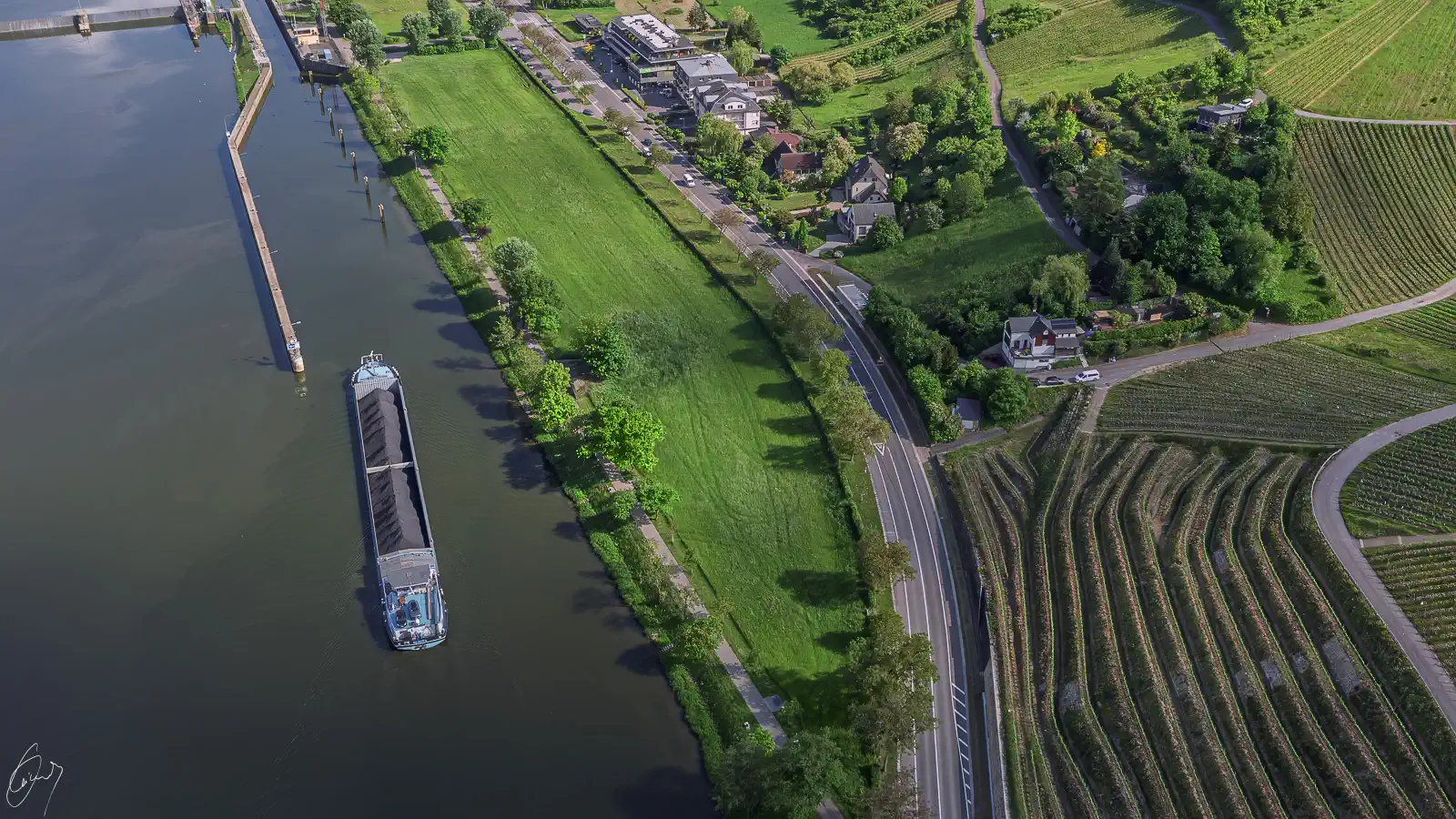 Ein Frachtschiff fährt in Stadtbredimus in die Schleuse